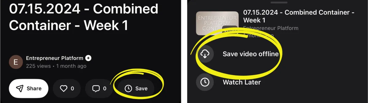 Click "Save" and then "Save video offline" to save it to the app for offline viewing later.